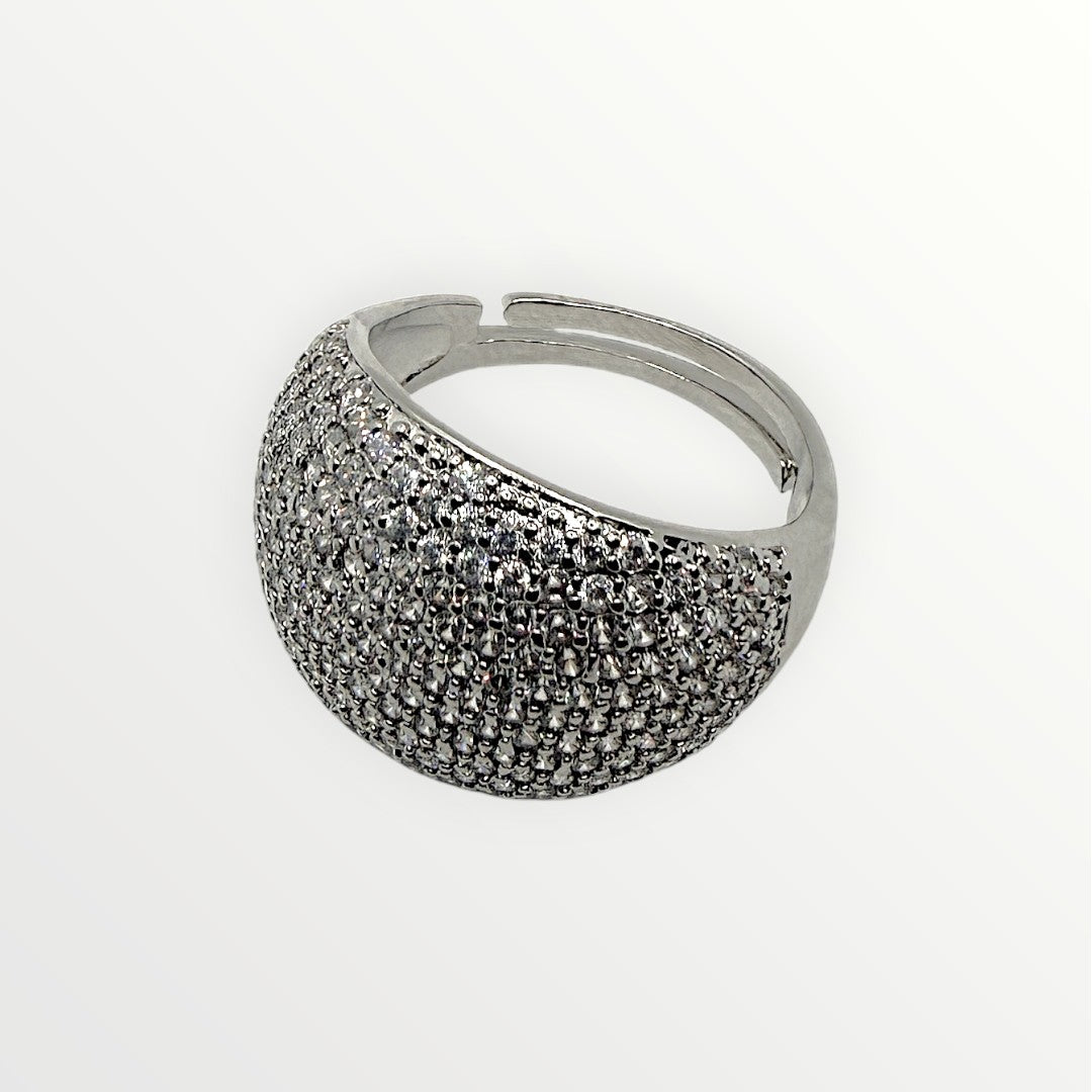 Anello regolabile realizzato in ottone, caratterizzato da una fascia bombata completamente ricoperta da zirconi incastonati che creano un effetto pavé fitto e luminoso.