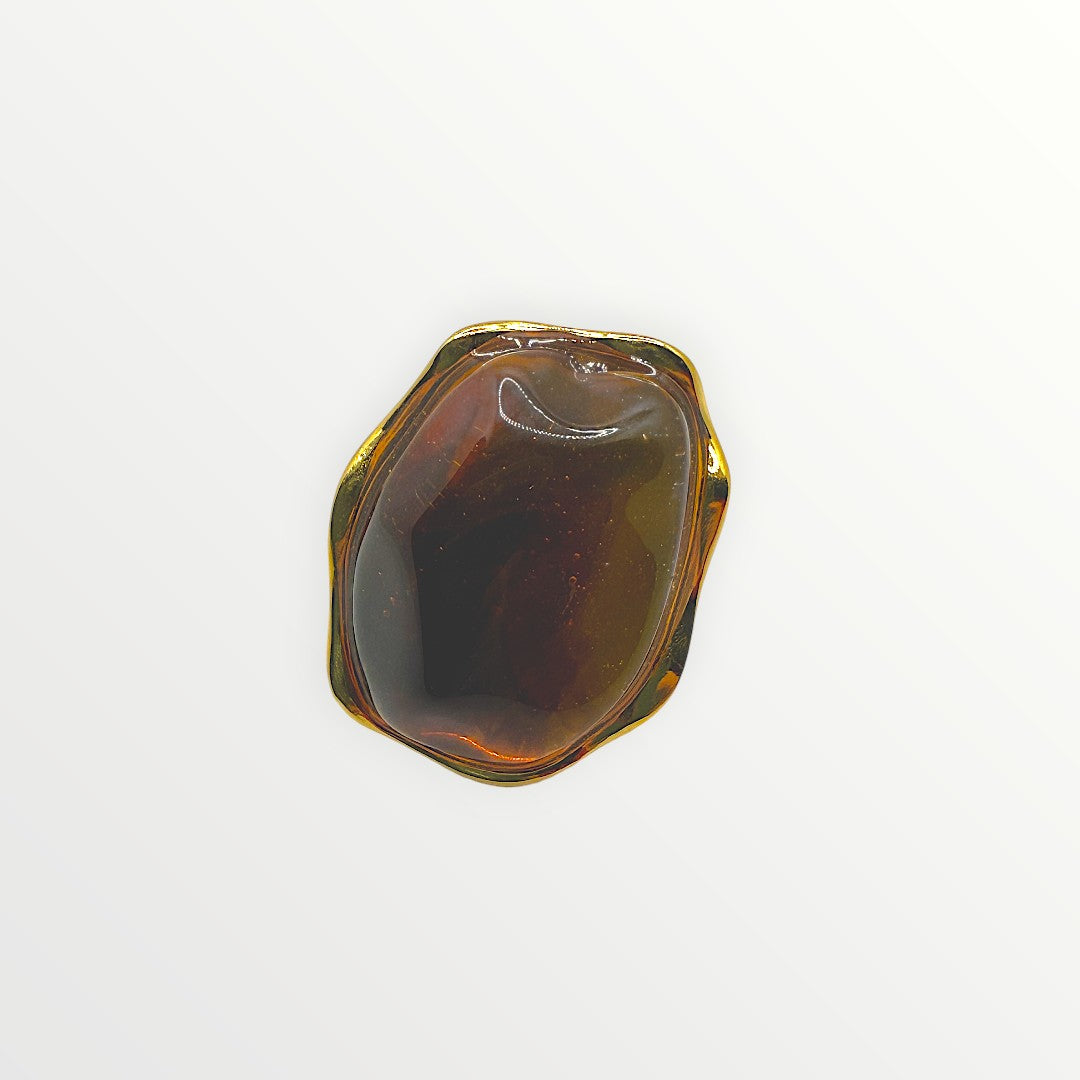 Anello a fascia bombata dal design contemporaneo, caratterizzato da una superficie liscia a specchio che abbraccia un'importante pietra centrale in acrilico dalle sfumature calde del marrone e dell'ambra.