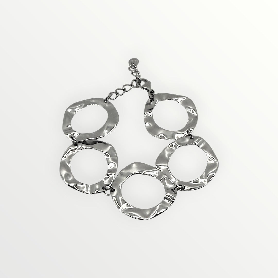 Bracciale composto da ampi elementi circolari irregolari, uniti fra loro per creare un design moderno e scultoreo.