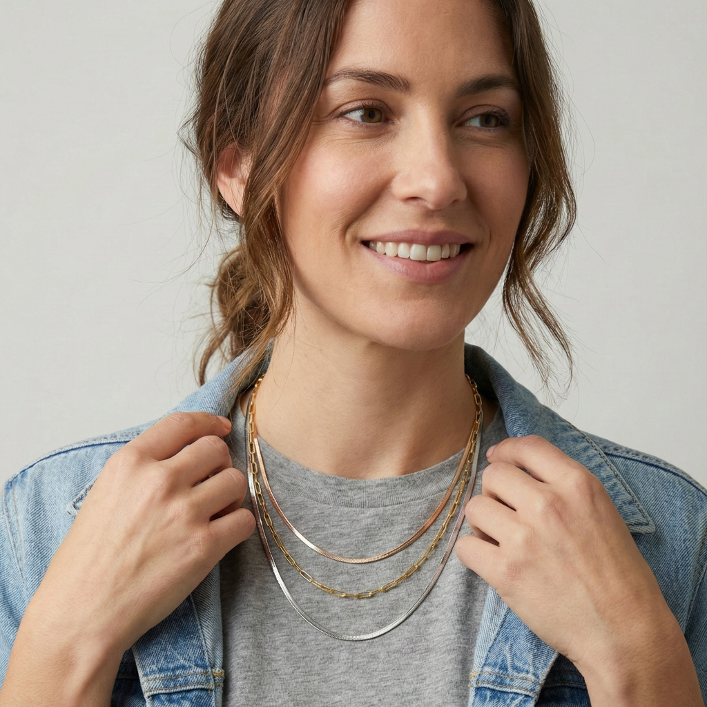 Collana in acciaio inossidabile dalla linea essenziale, caratterizzata da due maglie piatte e una catena che si posano con naturalezza sul décolleté. La finitura lucida crea un effetto di luce continua sulla superficie metallica, rendendola un accessorio versatile e pratico, adatto ad essere indossato in ogni occasione della giornata.
