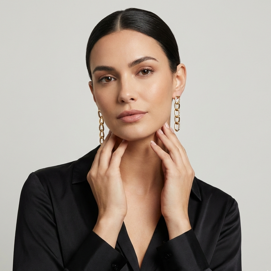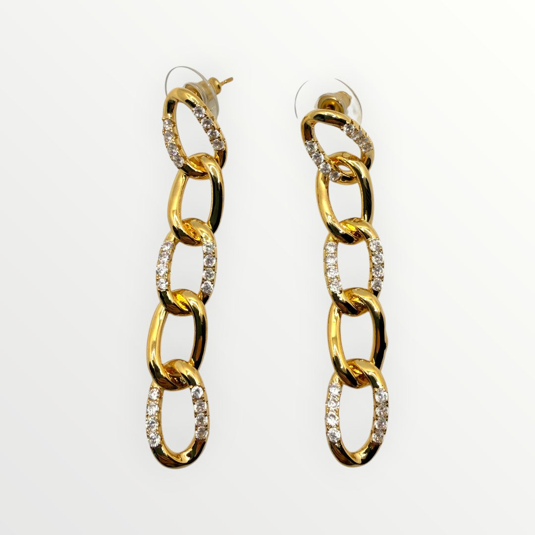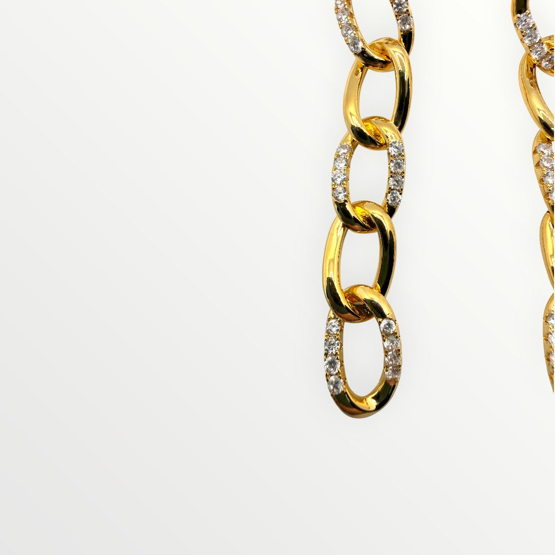 Orecchini a lobo pendenti dal design contemporaneo, caratterizzati da una silhouette a catena a maglie scalate. Questo accessorio fonde l'estetica urban della catena con l'eleganza classica della luce, creando un movimento fluido e luminoso ad ogni passo.