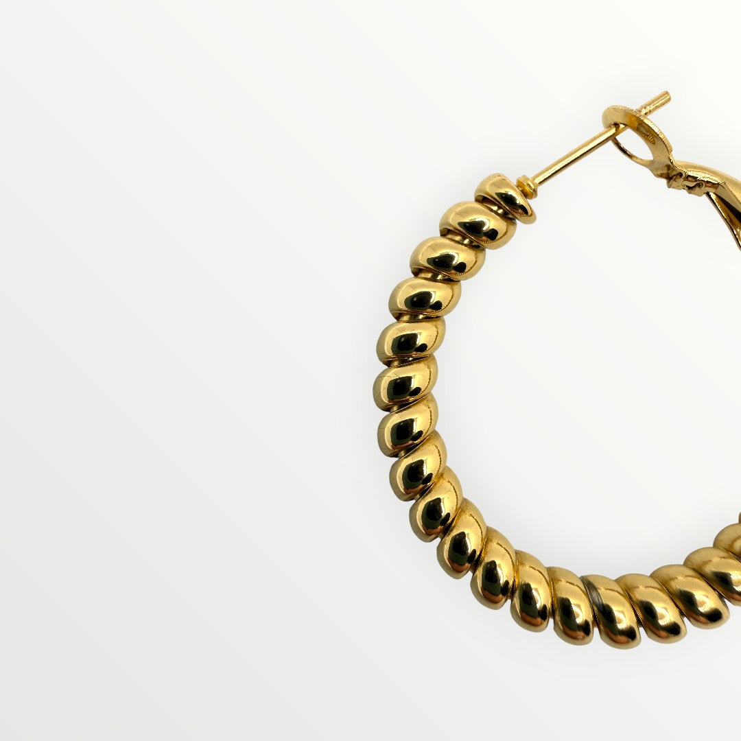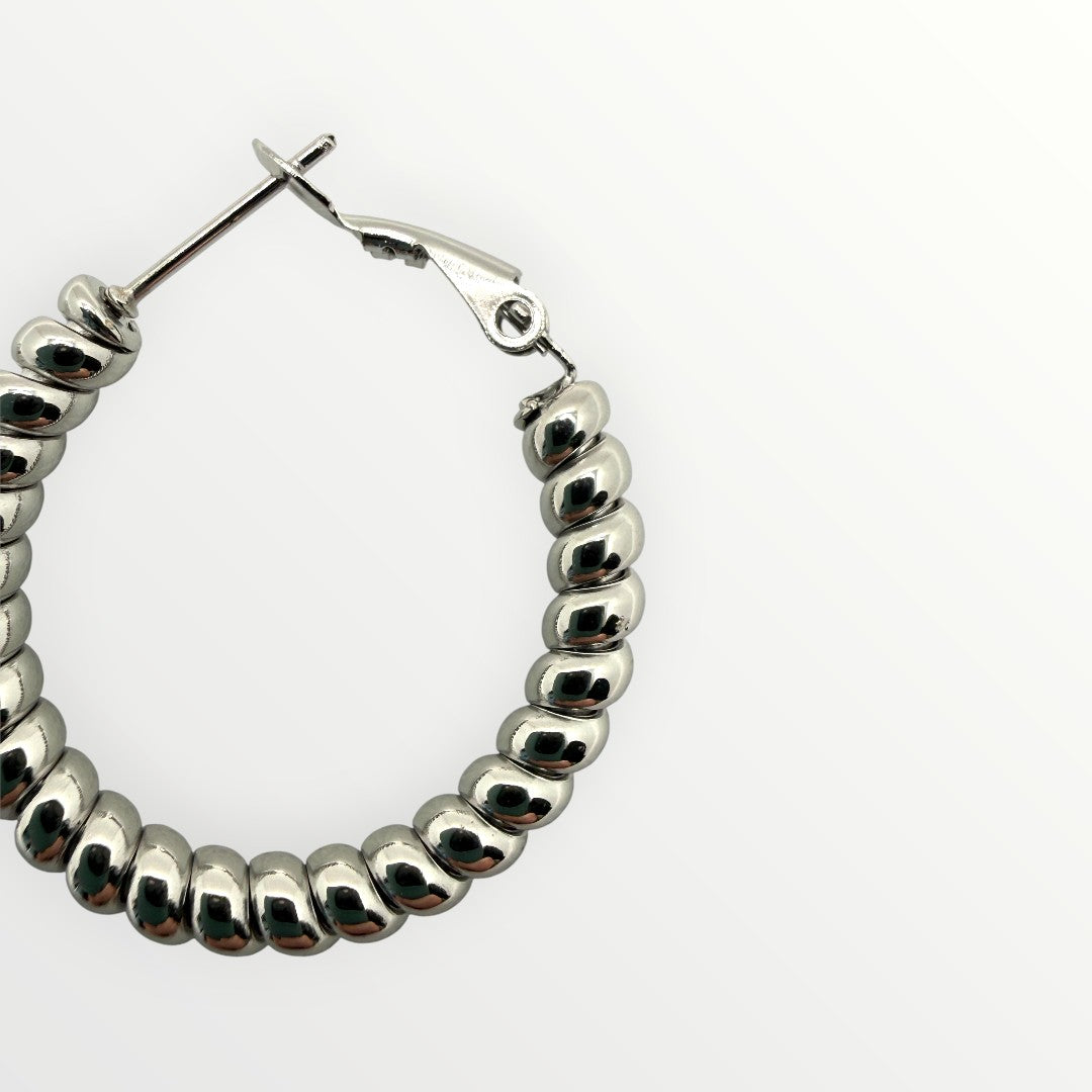 Orecchini a cerchio dal design moderno caratterizzati da una silhouette bombata e voluminosa. La superficie liscia ed estremamente lucida riflette la luce in modo uniforme, creando un punto luce audace ma sofisticato che incornicia il volto con eleganza contemporanea.