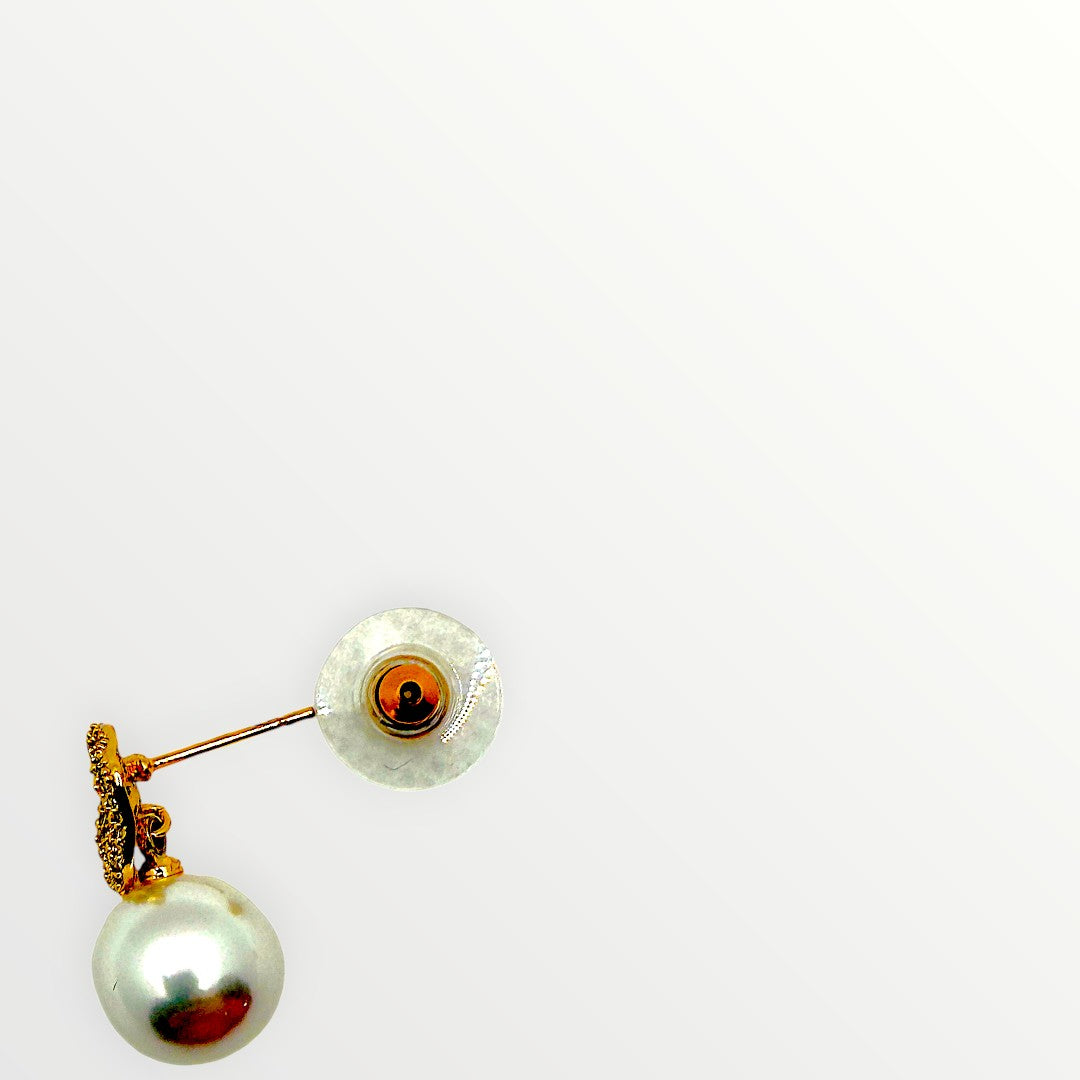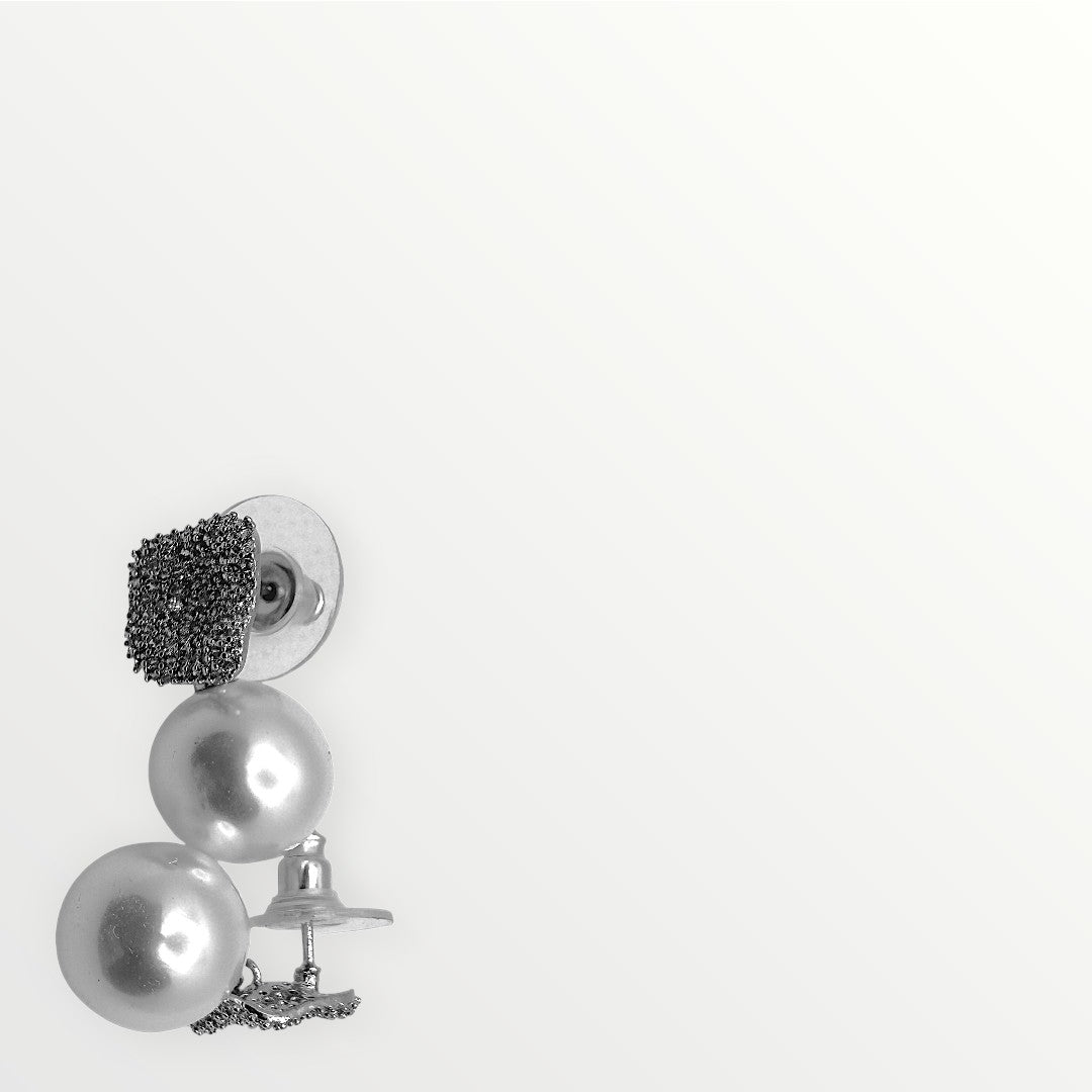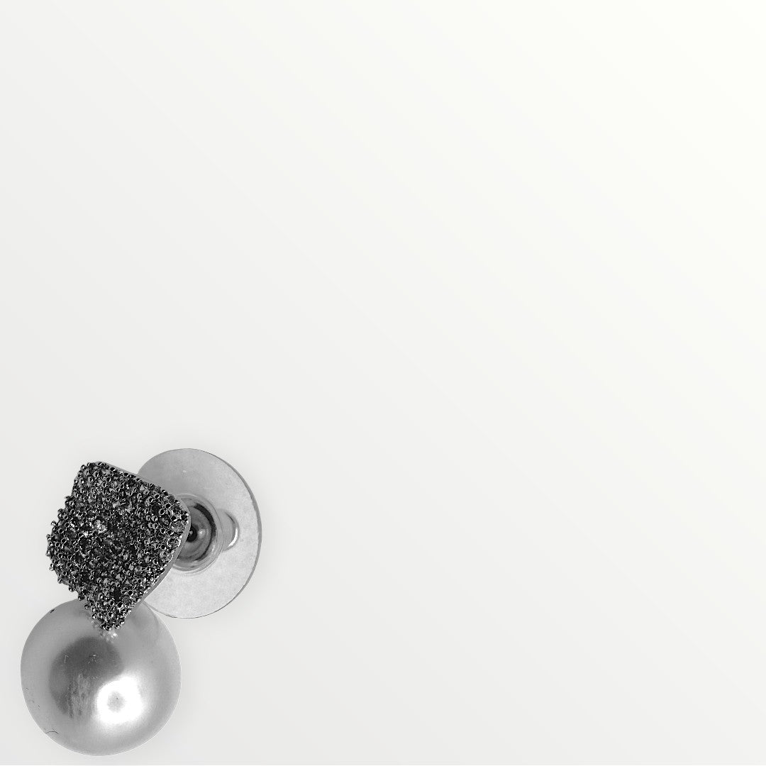 Orecchini in ottone con dettaglio perlato in plastica e cubo di strass, dal design geometrico e moderno.